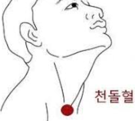 천돌혈은 목 아래쪽 쇄골뼈 사이 움푹 파인 곳입니다. 기관지와 가장 가까운 혈자리로, 기침.천식, 기관지염등에 효과적입니다. 검지로 천천히 누르면서 원을 그리듯 마사지 합니다.