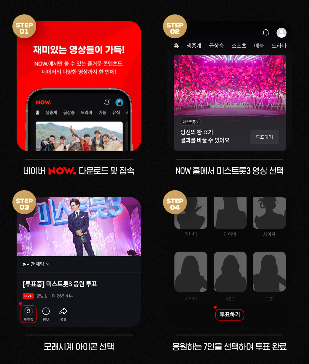 - NOW 앱에서 응원 투표에 참여하면, 자동으로 갈라쇼 티켓 이벤트에 응모됩니다.