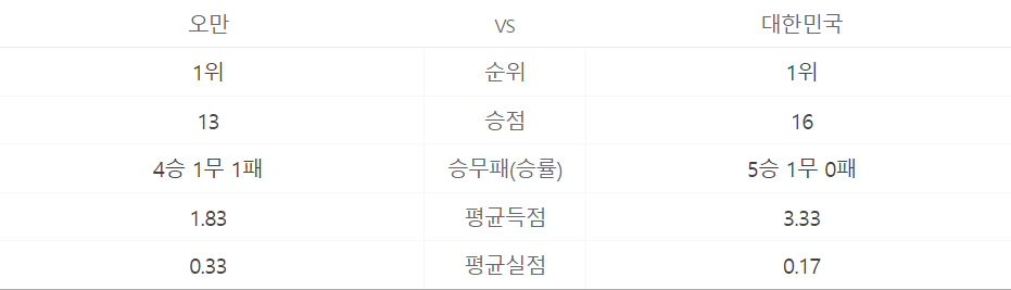 한국과 오만의 전적과 전력은 다음과 같습니다. 피파랭킹은 오만은 76위, 한국은 23위 입니다.